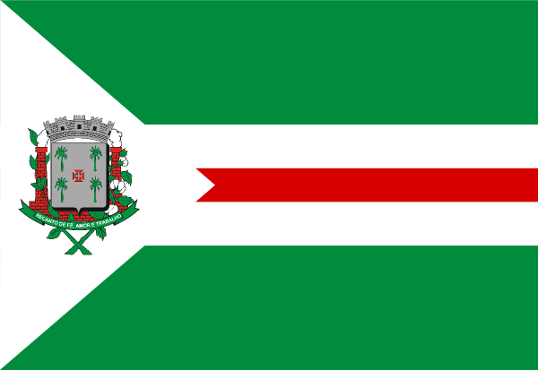 "Esquartelada em faixa, sendo os quartéis verdes, constituídos por uma faixa branca sobrecarregada de uma faixa vermelha, disposta no sentido horizontal e que parte de um triângulo branco firmado na tralha, onde o Brasão Municipal é aplicado".