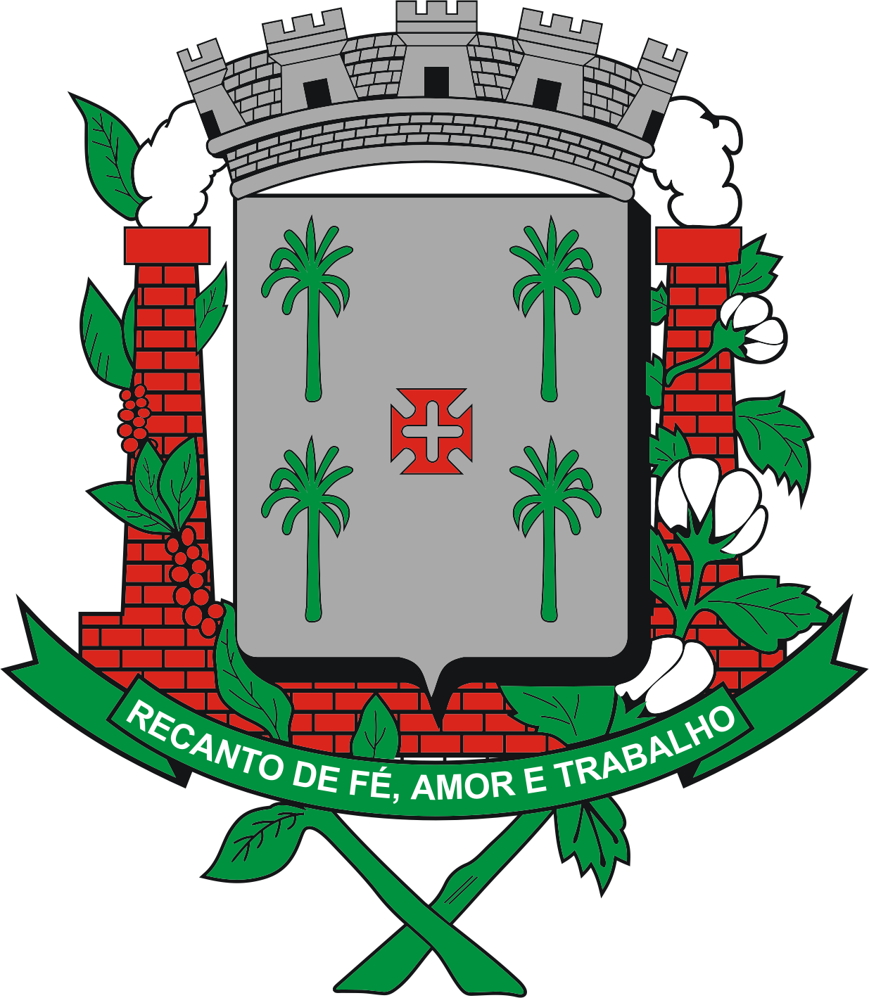 O brasão ora criado é descrito heraldicamente da seguinte forma: "Escudo Samnítico, encimado pela coroa mural de prata de oito torres. Pleno de prata, com quatro palmeiras acantonadas, de sua cor; em abismo do escudo, uma cruz pátea de gles e vasia de prata. Como suportes, duas chaminés de goles, fumegantes, às quais se enroscam à dextra o ramo de café frutificado ao natural e à sinistra um ramo de algodão florido, entrecruzados em ponta, sobre os quais se sobrepõe um listel de sinopla, contando em letras de prata a divisa: RECANTO DE FÉ, AMOR E TRABALHO."